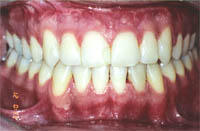 Caso necessitando reposicionamento ortodôntico dos dentes superiores a fim de permitir o correto posicionamento dos implantes na região dos incisivos laterais.